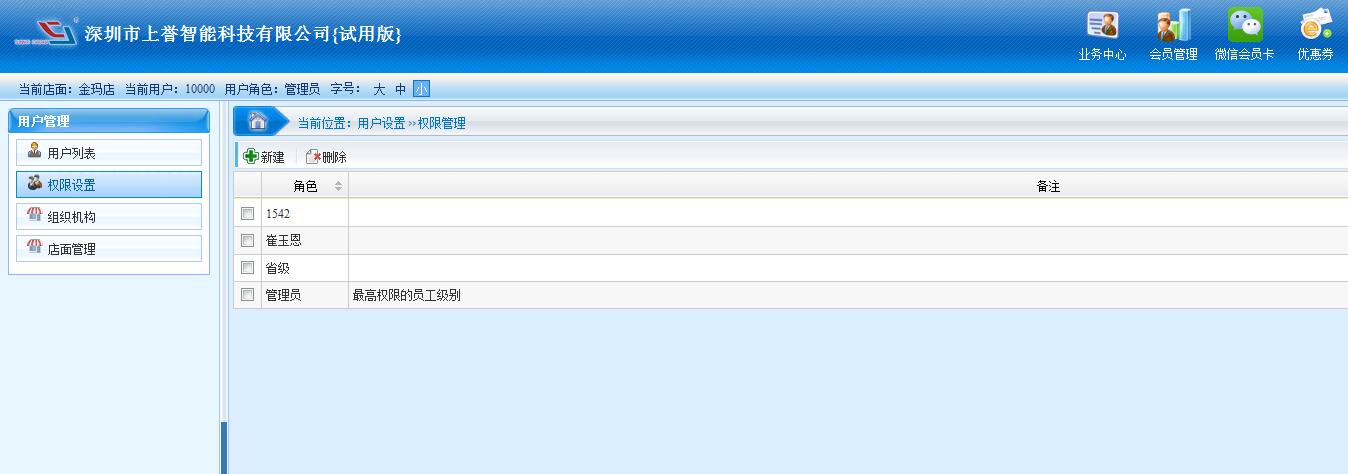 用戶管理功能有:用戶列表、權(quán)限設(shè)置、組織機(jī)構(gòu)、店面管理等等。 用戶列表:用于會員管理設(shè)置分賬號使用。