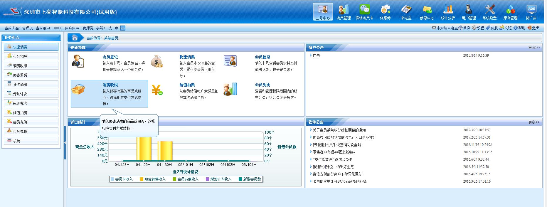 業務中心是實現針對會員的基本操作,如“快速消費、消費收銀、顧客退貨、計次消費、增加計次”等,還可以查看這個會員的登記信息和所有消費記錄、兌換記錄及退貨記錄等。