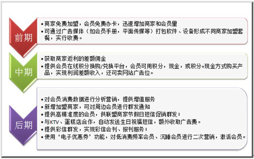 前期:向聯盟商家收取加盟費或者廣告費,向會員銷售聯盟卡,或者收取入會費;