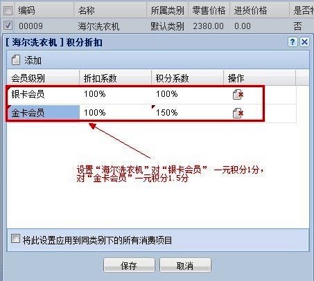 4、設(shè)置消費(fèi)項(xiàng)目的積分比例: